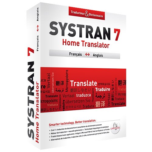 SYSTRAN 7 HOME TRANSLATOR ANGLAIS/FRANCAIS/ANGLAISSYSTRAN 7 HOME TRANSLATOR français-anglais / anglais-françaisLe meilleur de la technologie pour des traductions de qualité 2 en 1 : Traduction de textes et Consultation de dictionnaires bilingues Moteur de traduction à double technologie, linguistique et statistique Traduction depuis toute application. Intégré à Microsoft® Word, Internet Explorer, Firefox Alternatives de traduction, Traduction côte à côte, Dictionnaire personnel et bien plus Leader de la traduction automatique depuis plus de 30 ans, SYSTRAN s'est constamment imposé comme le choix des utilisateurs qui demandent les meilleurs résultats de la traduction automatisée. Sa version 7 franchit un nouveau palier dans...